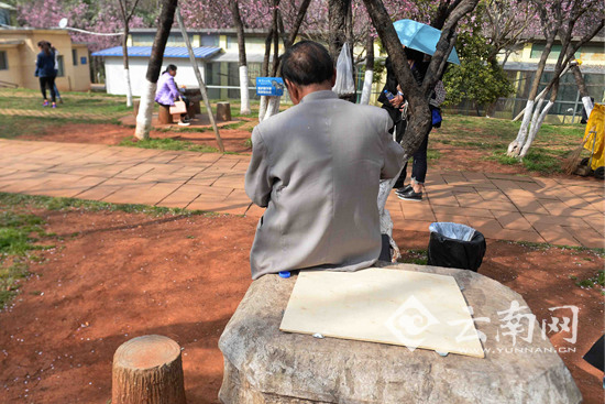 時值櫻花盛開,昆明動物園游人如織。不過記者發現,供游人休息的石桌石凳變成了麻將桌,有的還收費。