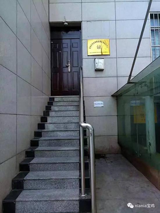 陜西寶雞市勞動保障監(jiān)察舉報投訴中心門前,一個舉報箱被釘?shù)谩案吒咴谏稀保嚯x地面3米高,門口還有監(jiān)控攝像頭。