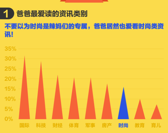 不要以為時尚是辣媽的專屬,爸爸也是愛看時尚類資訊的!16.5%的爸爸們在閱讀資訊時會選擇時尚類。