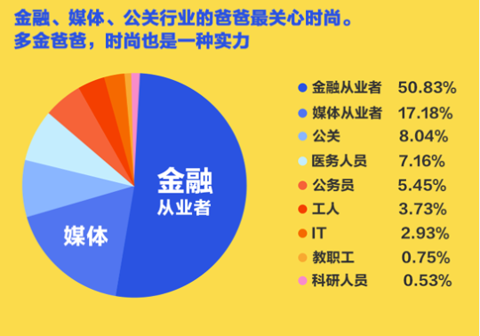 談到時尚爸爸的職業分布,數據統計表明來自金融、媒體、公關行業的爸爸最關心時尚,其中金融行業占據過半。看來,對于多金爸爸來說,時尚也是一種實力。