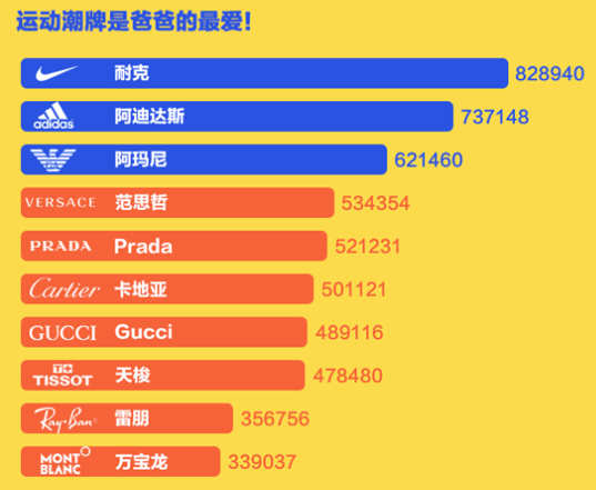 爸爸最青睞的時尚品牌方面里不乏阿瑪尼、范思哲、Prada這類奢侈品牌,不過,排名最靠前的還屬耐克與阿迪達斯,看來,運動潮牌才是爸爸的最愛。