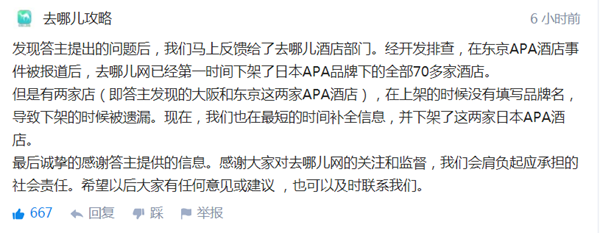 近兩日在網上鬧得沸沸揚揚的APA酒店“重現事件”有了新轉機。有記者在13日16時許登錄知乎,發現去哪兒駐知乎官方賬號“去哪兒攻略”在知乎答主王瑞揚回答下方的評論區回應道,經排查,在東京APA酒店事件被報道后,去哪兒網已第一時間下架了日本APA品牌下的全部70多家酒店,但有兩家店(即答主發現的大阪和東京這兩家APA酒店)在上架時沒有填寫品牌名,導致下架時被遺漏。現在,去哪兒網已經補全信息,并下架了這兩家酒店。(環球網)