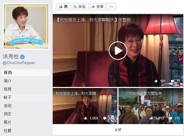 正在大陸進行參訪的中國國民黨前主席洪秀柱13日晚間在上海進行社交網絡直播,對蔡當局最近推行的種種政策進行檢視,認為都在造成臺灣社會對立。直播中她呼吁國民黨現任主席吳敦義強硬起來,“趕快結合我們所有藍軍支持者,以及立法機構黨團,我們真的要有所作為了!”(人民日報海外版-海外網)