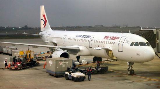 1月20日東方航空班機飛抵桃園機場。(圖:中時電子報)