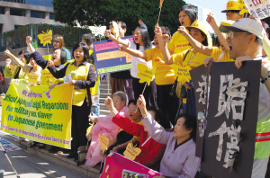 臺灣婦女救援社會福利事業基金會國際事務部主任賴采兒一行人專程從臺灣趕來參加示威以及研討會。手舉“臺灣阿媽要求日本政府謝罪賠償”牌子的賴采兒說,許多曾經被迫充當“慰安婦”的阿媽都已超過90高齡,因身體虛弱、行動不便而無法來美參加本次活動。她說,臺灣目前健在的“慰安婦”大約有25名。