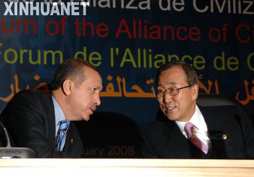 1月15日,在西班牙首都馬德里,聯合國秘書長潘基文(右)與土耳其總理埃爾多安在會上交談。當日,首屆文明聯盟論壇在馬德里舉行,論壇旨在探討如何彌合不同國家和文化之間的分歧、為推動跨文化交流建立伙伴關系。來自多國政府、基金會、國際組織、社會團體、媒體和企業界的代表出席論壇。 新華社記者陳海通攝