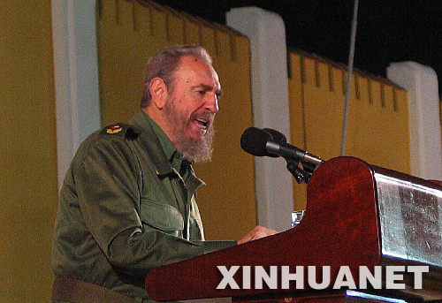 2008年2月19日,正在術(shù)后康復(fù)中的古巴領(lǐng)導(dǎo)人菲德爾·卡斯特羅宣布,他將“不尋求也不接受”國務(wù)委員會主席和革命武裝部隊(duì)總司令這兩個職務(wù)。圖為2003年7月26日晚,卡斯特羅在圣地亞哥東北部蒙卡達(dá)兵營舊址舉行的集會上發(fā)表講話。 新華社記者趙凱攝