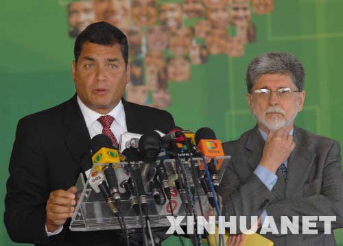 3月5日,厄瓜多爾總統(tǒng)科雷亞(左)在巴西利亞舉行記者會(huì)。科雷亞表示,厄瓜多爾希望美洲國(guó)家組織能夠盡快行動(dòng),組成一個(gè)調(diào)查委員會(huì)調(diào)查由于哥倫比亞軍隊(duì)進(jìn)入厄瓜多爾境內(nèi)打死哥反政府組織領(lǐng)導(dǎo)人所引發(fā)的外交危機(jī)。