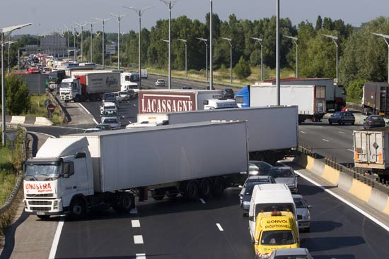 6月30日,在法國西南部的波爾多,一條環城公路被卡車堵塞。