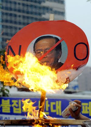 與來自民間的反對聲浪相比,韓國政府十天里也動作頻頻。除14日當天李明博通過發言人“深表遺憾”,并指示政府“嚴正對待”外,韓國外交部立即召見日本駐韓大使要求其“糾錯”,并命令韓駐日大使迅速回國。韓國教育科技部也向日本文部科學省發去了抗議書。韓國各地方政府則陸續中斷了同日本的交流。