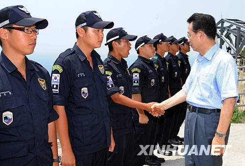 7月29日,韓國總理韓升洙在獨島(日本稱“竹島”)上慰問執行任務的警務人員。 新華社/法新