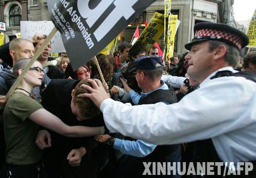 10月10日,在英國首都倫敦,參加反對(duì)救市示威游行的青年學(xué)生與警察發(fā)生沖突。一些倫敦市民和學(xué)生當(dāng)天在倫敦金融街舉行反對(duì)政府救市示威游行活動(dòng),并打出“反對(duì)資本家”、“我們?yōu)槭裁匆獮樗麄冎圃斓奈C(jī)埋單”等標(biāo)語。當(dāng)日倫敦股市出現(xiàn)大跳水,《金融時(shí)報(bào)》100種股票平均價(jià)格指數(shù)跌幅高為8.85%。 新華社/法新
