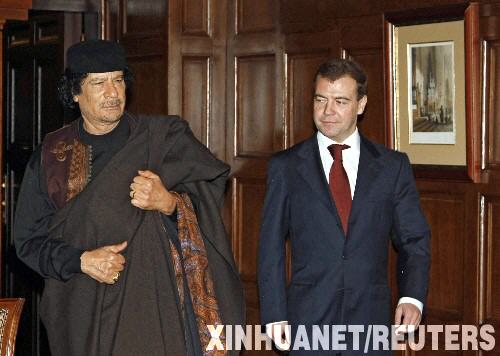 梅德韋杰夫對卡扎菲說:“我們兩國需要共同討論經濟問題、在國際政治領域中的協作問題以及兩國關系中的重大事項,并協調在很多問題上的立場。”