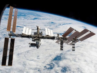 從“奮進”號航天飛機上看到的國際空間站,空間站背后是蔚藍色的地球及黑色浩瀚的宇宙。