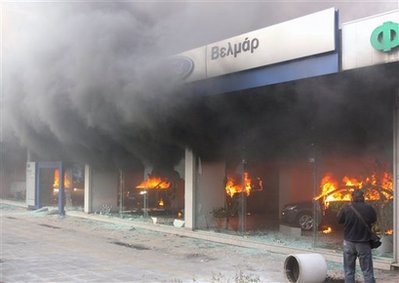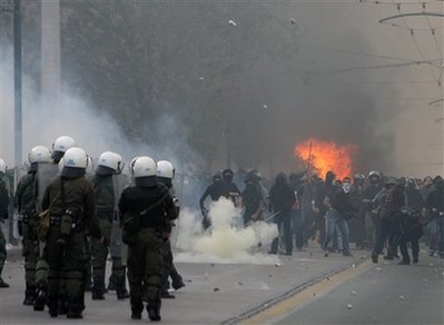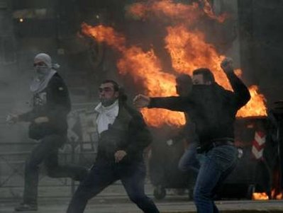 在雅典和北部的薩洛尼卡市中心,大群學(xué)生組成的示威隊(duì)伍向銀行、商店和車輛投擲燃燒瓶,警察不得不使用催淚瓦斯驅(qū)散示威人群。帕特拉斯、克里特島和科孚島也有騷亂發(fā)生。