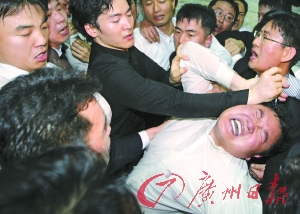 據悉,韓國一國會委員會18日提交了與美國的自由貿易法案,結果招致國會議員之間發生激烈沖突,有議員揮舞大錘試圖沖破辦公家具排成的防線。沖突中一人頭部流血,另一人被打掉了幾顆牙齒。有幾扇門被打倒,門后防線內的桌子被打成碎片。