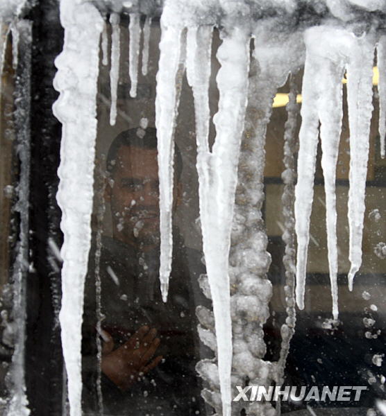 3月2日,在美國紐約,一名男子從掛滿冰柱的窗戶內(nèi)向外張望。新華社記者劉欣攝