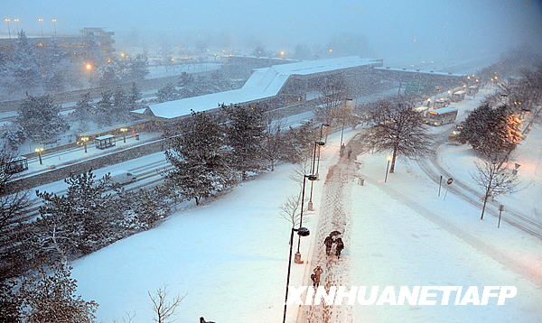 3月2日,在美國弗吉尼亞州維也納的一個城鐵站附近,行人冒雪步行。新華社/法新