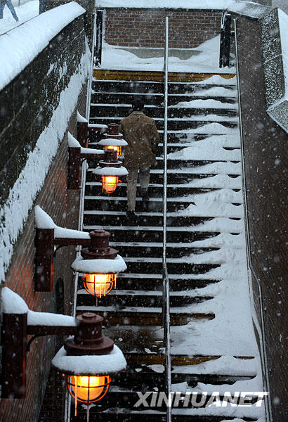 3月2日,一位乘客從紐約中央公園附近的一個地鐵站內(nèi)走出。1日起襲擊紐約的強降雪在2日上午達到23厘米。新華社記者申宏攝