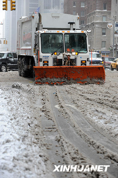 3月2日,鏟雪車在紐約曼哈頓的道路上清理積雪。美國東部地區(qū)從1日夜開始遭受史上3月份罕見大雪襲擊。紐約市出動大約2000名環(huán)衛(wèi)工人投入到除雪等工作中,雖然大雪給市民出行造成不便,但城市公交系統(tǒng)總體運行正常。新華社記者申宏攝