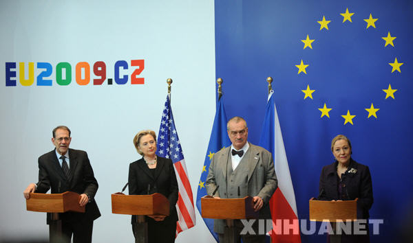 3月5日,在比利時首都布魯塞爾的歐盟總部,歐盟負責外交與安全事務的高級代表索拉納、到訪的美國國務卿希拉里·克林頓、歐盟輪值主席國捷克外長施瓦岑貝格和歐盟委員會負責對外關系和歐洲睦鄰政策的委員瓦爾德納(從左至右)共同會見記者。美國國務卿希拉里·克林頓當天到訪歐盟,并將于當晚在瑞士日內瓦與俄羅斯外長拉夫羅夫舉行會談。新華社記者武巍攝