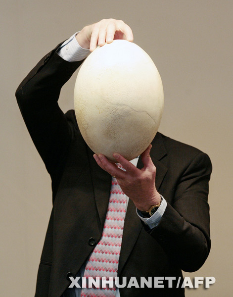 3月25日,一名男子在英國倫敦展示一枚據稱是“世界上最大的蛋”。這枚由已經滅絕的馬達加斯加象鳥在十七世紀產下的蛋,將在當天舉行的切爾西古董展上出售,標價5000英鎊(約合7340美元)。新華社/法新