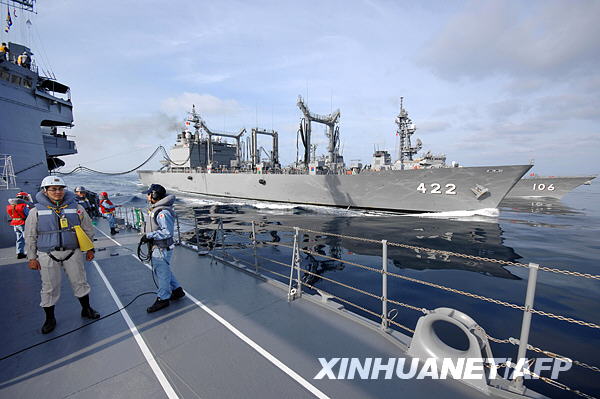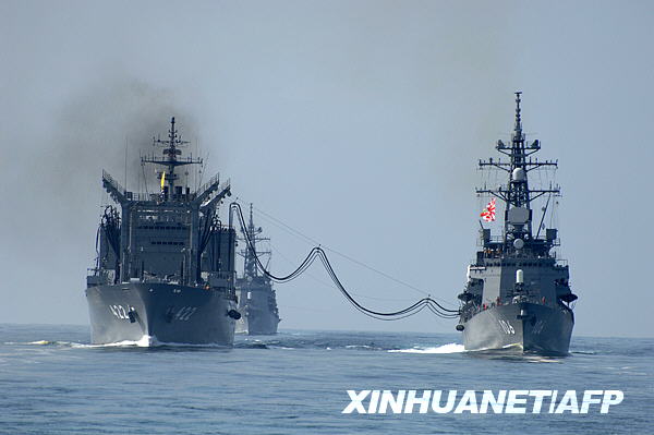 這張3月28日在亞丁灣拍攝的照片顯示,日本海上自衛(wèi)隊(duì)的“十和田”補(bǔ)給艦(右,422號)在為“漣”號驅(qū)逐艦(左)加油。