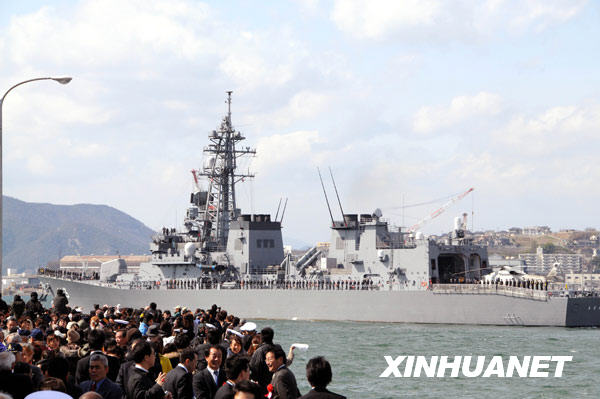 3月14日,“漣”號驅(qū)逐艦駛離日本廣島縣的吳基地。日本防衛(wèi)大臣浜田靖一13日發(fā)布命令,啟動“海上警備行動”,向索馬里附近海域派遣海上自衛(wèi)隊(duì)艦艇應(yīng)對海盜威脅。根據(jù)這一命令,駐扎在廣島縣吳基地的“漣”號和“五月雨”號兩艘驅(qū)逐艦于14日啟程,預(yù)計最早在4月上旬抵達(dá)索馬里海域,開始為日本相關(guān)船只進(jìn)行護(hù)航。兩艦共有400名乘員,除海上自衛(wèi)隊(duì)特種部隊(duì)“特別警備隊(duì)”隊(duì)員外,還包括8名擁有逮捕海盜等司法權(quán)限的海上保安廳官員。新華社記者錢錚攝