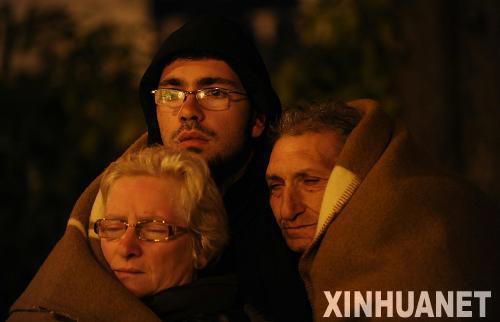 4月7日凌晨,在意大利中部地震災區拉奎拉市,三名災民裹著毯子依偎在一起。新華社記者武巍攝