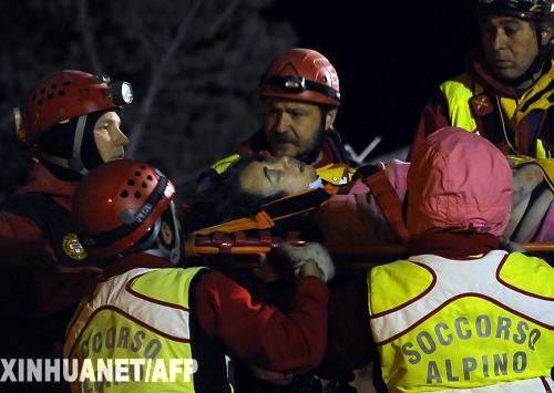 4月7日,在意大利阿布魯佐區首府拉奎拉市,在地震廢墟中被埋了20個小時后獲救的一名女子被送往醫院救治。新華社/法新