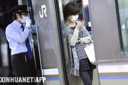 5月17日,在日本兵庫縣神戶的新干線車站內,工作人員和乘客都戴上了口罩。新華社/法新