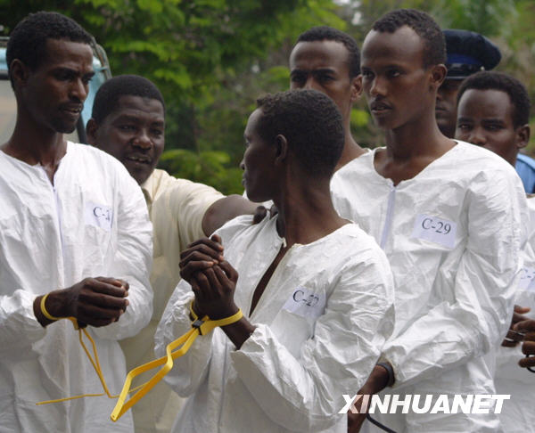 6月10日,部分索馬里海盜嫌疑人在肯尼亞東部港口城市蒙巴薩準(zhǔn)備接受處理。當(dāng)天,美國海軍向肯尼亞警方移交了17名海盜嫌疑人,這17人是今年5月13日在亞丁灣海域襲擊一艘駛往埃及亞歷山大港的商船時(shí)被美軍抓獲的。新華社發(fā)