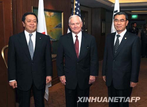 5月30日,美國國防部長蓋茨(中)、日本防衛大臣濱田靖一(左)以及韓國國防部長官李相熹在新加坡就朝鮮半島局勢發展舉行會晤。美日韓國防部長當日在新加坡表示,朝鮮半島核問題對地區和平與安全構成了威脅,三國將加強彼此之間的合作,并與其他國家一道致力于解決這一問題。新華社/法新