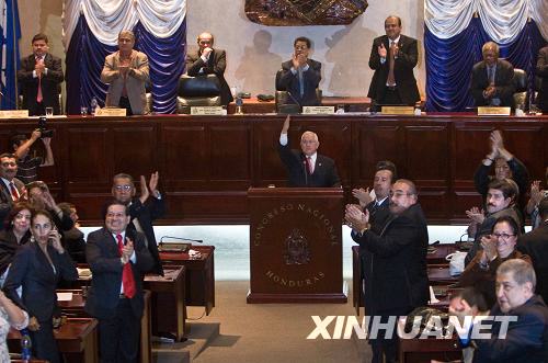 6月28日,洪都拉斯議會議長羅伯托·米凱萊蒂(中)在首都特古西加爾巴宣誓就任該國臨時總統(tǒng)后向議會其他成員致意。洪都拉斯議會在當天舉行的緊急會議上經(jīng)過磋商和激烈辯論,通過了由議長米凱萊蒂出任國家臨時總統(tǒng)的決議。 新華社發(fā)(戴維攝)