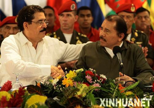 6月28日,洪都拉斯總統(tǒng)塞拉亞(左)和尼加拉瓜總統(tǒng)奧爾特加出席在尼首都馬那瓜舉行的“美洲玻利瓦爾替代計劃”成員國緊急首腦會議。塞拉亞當晚抵達尼加拉瓜首都馬那瓜,出席專門為洪都拉斯局勢而于當晚召開的“美洲玻利瓦爾替代計劃”成員國緊急首腦會議和29日舉行的中美洲一體化體系成員國緊急首腦會議。洪都拉斯最高法院28日以妨礙國家法律尊嚴為由,通過了對塞拉亞的罷免決定。而塞拉亞則表示自己并沒有辭職,依然是洪都拉斯的合法總統(tǒng)。 新華社發(fā)(海羅·卡伊納攝)