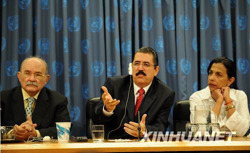 6月30日,在軍事政變中被廢黜的洪都拉斯總統塞拉亞(中)在美國紐約聯合國總部舉行的記者會上講話。第63屆聯大主席布羅克曼(左)出席記者會。塞拉亞對第63屆聯合國大會剛剛通過的決議表示歡迎,并稱這一譴責洪都拉斯軍事政變的聯合國新決議是一份“重要的、具有歷史意義的”文件。新華社記者谷欣容攝