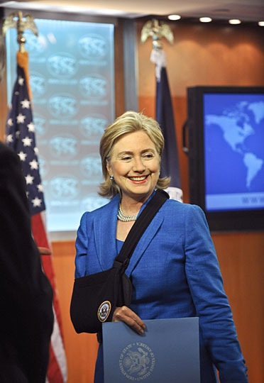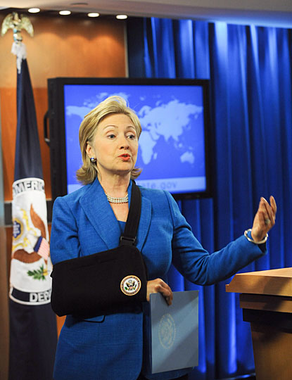 圖:美國國務卿希拉里帶傷舉行記者招待會