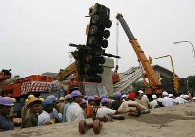 此前一天,該處地鐵施工工地發(fā)生高架橋坍塌事故,造成6人死亡、15人受傷。一天后,在該事故清理現(xiàn)場又發(fā)生了起重機(jī)倒塌事故,造成4人受傷。
