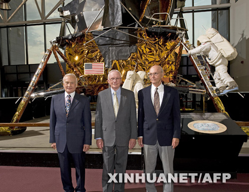 7月19日,首次將人類送上月球的阿波羅11號飛船的3名宇航員巴茲·奧爾德林、尼爾·阿姆斯特朗和邁克爾·柯林斯(從左至右)在華盛頓的美國國家航空航天博物館一起參加一場演講會。7月20日是人類登上月球40周年紀念日。新華社/法新
