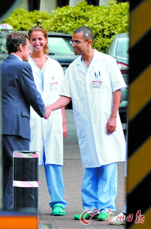 ▲薩科齊出院時與主治醫生握手告別。