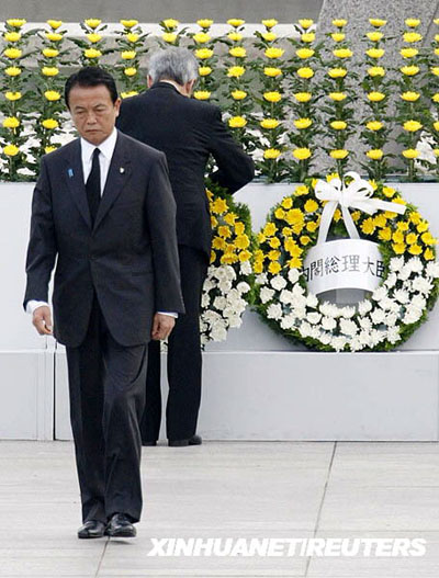 8月6日,在日本廣島,日本首相麻生太郎在向廣島原子彈轟炸的死難者獻花后離開。今年是日本廣島遭受原子彈轟炸64周年,日本各界人士在廣島舉行各種紀念活動,悼念原子彈爆炸死難者,祈禱世界和平。為敦促發動侵略戰爭的日本盡快投降,美軍于1945年8月6日和9日分別向日本廣島市和長崎市投下原子彈。日本是迄今世界上唯一一個遭受過原子彈轟炸的國家。新華社/路透