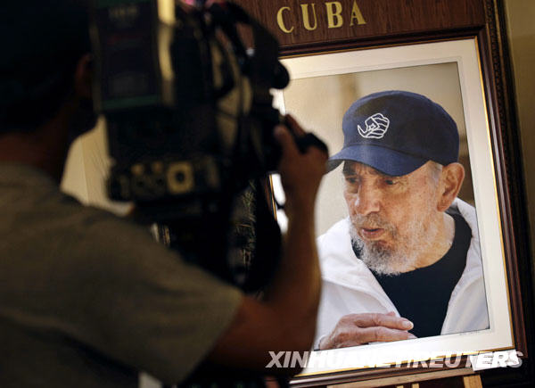 8月12日,在古巴首都哈瓦那,一名攝像師在展覽上拍攝一張古巴前領導人菲德爾·卡斯特羅的照片。菲德爾·卡斯特羅13日將迎來自己83歲生日。新華社/路透