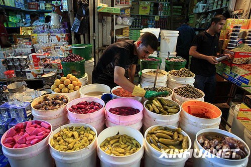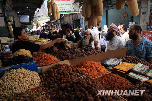8月20日,在加沙城的一個(gè)市場(chǎng)里,店主出售食品。隨著伊斯蘭教傳統(tǒng)齋月的臨近,巴勒斯坦穆斯林開始為齋月的到來儲(chǔ)備食物,提前做好準(zhǔn)備。新華社發(fā)(納賽爾攝)
