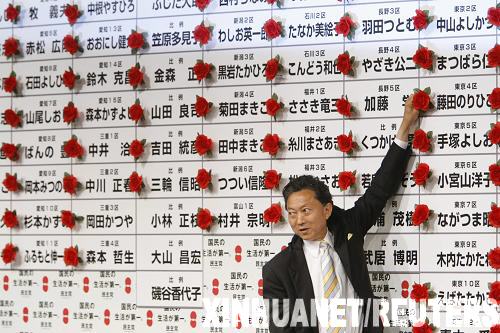 8月31日,在日本首都東京,日本民主黨黨首鳩山由紀夫站在民主黨候選人名單展板前。日本國會眾議院選舉最終結果于31日凌晨揭曉。最大在野黨民主黨獲得眾議院全部480個議席中的308席,超過控制眾議院各個常設委員會的絕對穩定多數269席,取得空前勝利。 新華社/路透