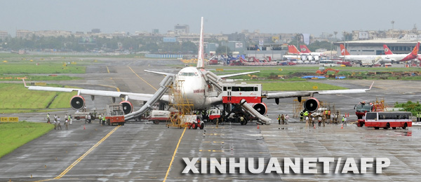 9月4日,在印度孟買的恰提拉帕提·希瓦吉國際機場,消防人員聚集在一架波音747飛機周圍。