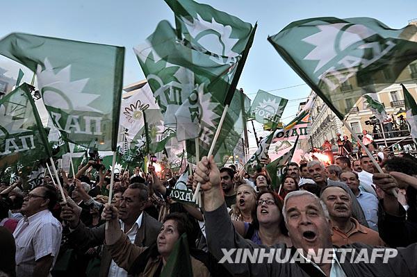 10月4日,在希臘首都雅典,希臘最大反對黨泛希臘社會主義運動(泛希社運)的支持者慶祝。新華社/法新