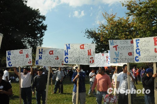 十月十三日,來自馬薩諸塞州、新罕布什爾州等的二十多個倡導移民改革團體組織數千人在國會山舉行綜合移民改革大型集會。圖為集會者高舉自己制作的標語,上面寫著“我們是工人不是罪犯”等標語。 中新社發 吳慶才 攝