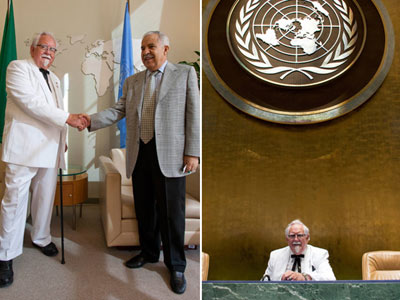 中新網10月29日電 據英國《每日電訊報》27日報道,一名冒充肯德基創始人桑德斯上校(亦稱肯德基爺爺)的男子竟然設法進入紐約聯合國總部,并同新任聯大主席握手拍照。