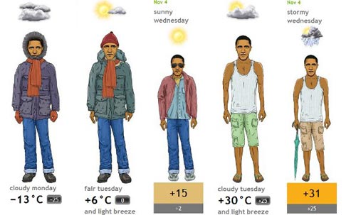 該網(wǎng)站的設(shè)計者宣稱:“有了奧巴馬天氣預(yù)報網(wǎng),你再也不必查看溫度計,或是把頭探出窗外看別人穿些什么。你只須看看奧巴馬和他的朋友怎么穿就夠了。”