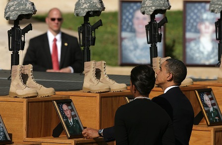 2009年11月10日,美國總統奧巴馬與夫人米歇爾在胡德堡軍事基地悼念槍擊案遇難者。